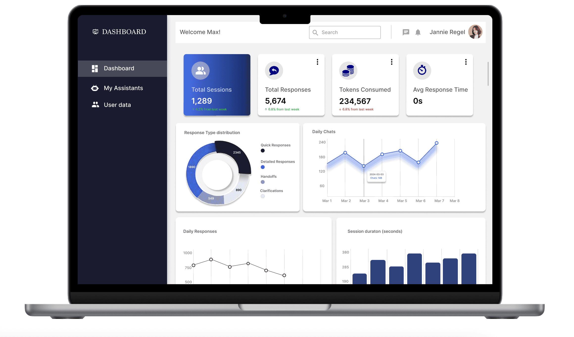 I sketched multiple variations of a dashboard “health” view, prioritized top KPIs, and created an IA for dashboards, assistant management, and user data.