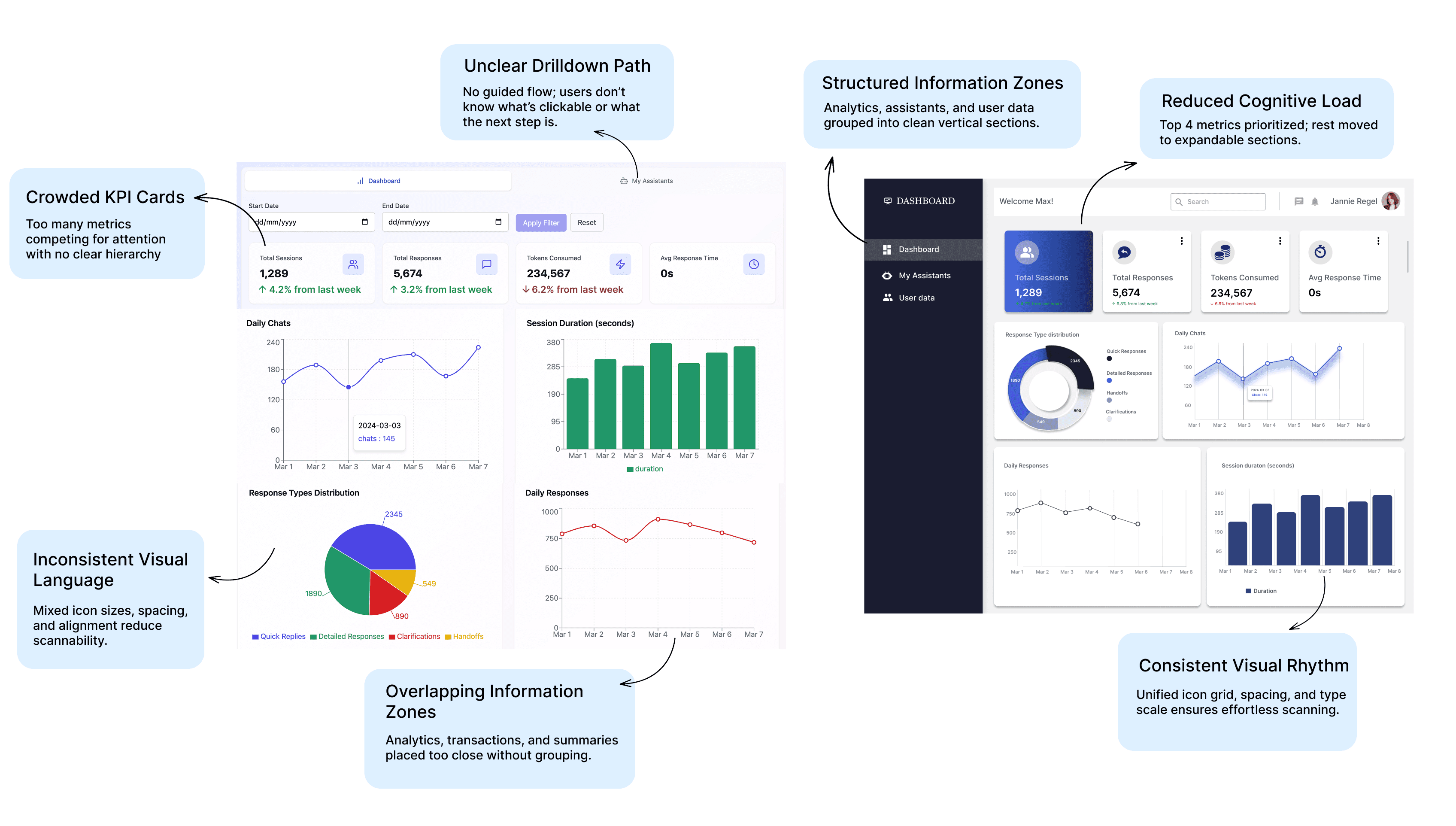 The original dashboard (on left) and the redesign (on right) highlighting the improvised segments and the reasons for the changes